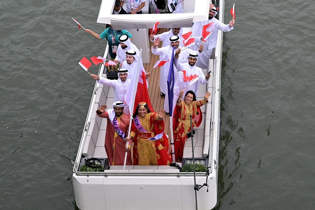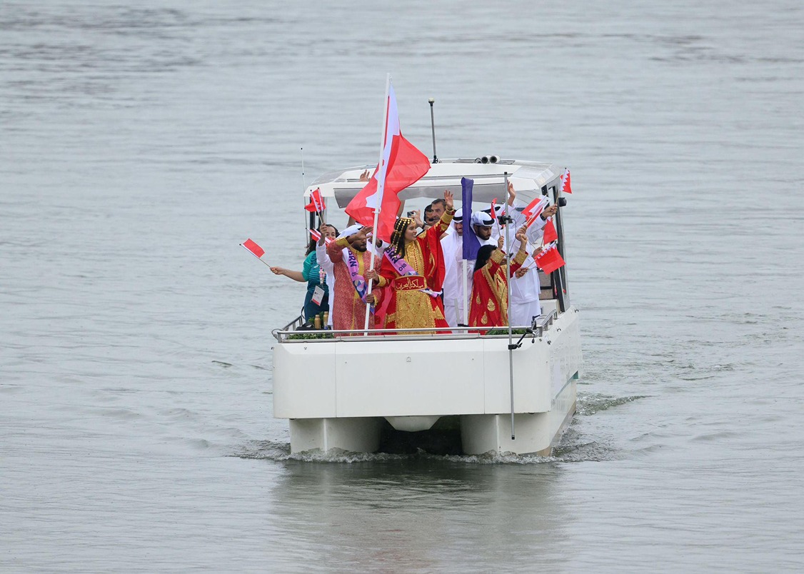 Bahrain’s delegation, carrying the hopes and aspirations of the nation, sailed through the heart of Paris in boat number 7. Swimmers Amani Al-Obaidli and Saud Salah Ghali had the honor of bearing the Bahraini flag, a symbol of national pride. As their boat glided past, Shaikh Isa extended a warm greeting, expressing his support and encouragement to the athletes.