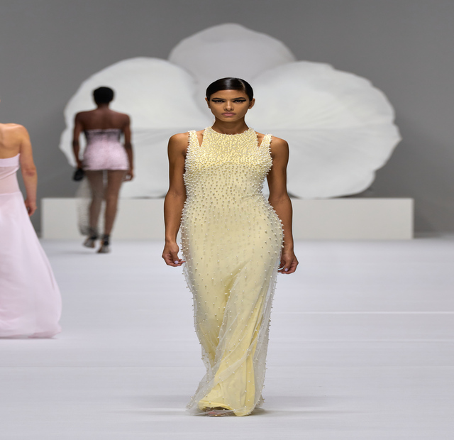At the heart of the collection is a color story that mirrors the calm and softness of springtime. Shades of blush pink, butter yellow, and light blue dominate the lineup, evoking the serenity of blooming gardens and morning skies. These pastels aren’t just trendy—they’re timeless, setting the tone for effortless elegance.
