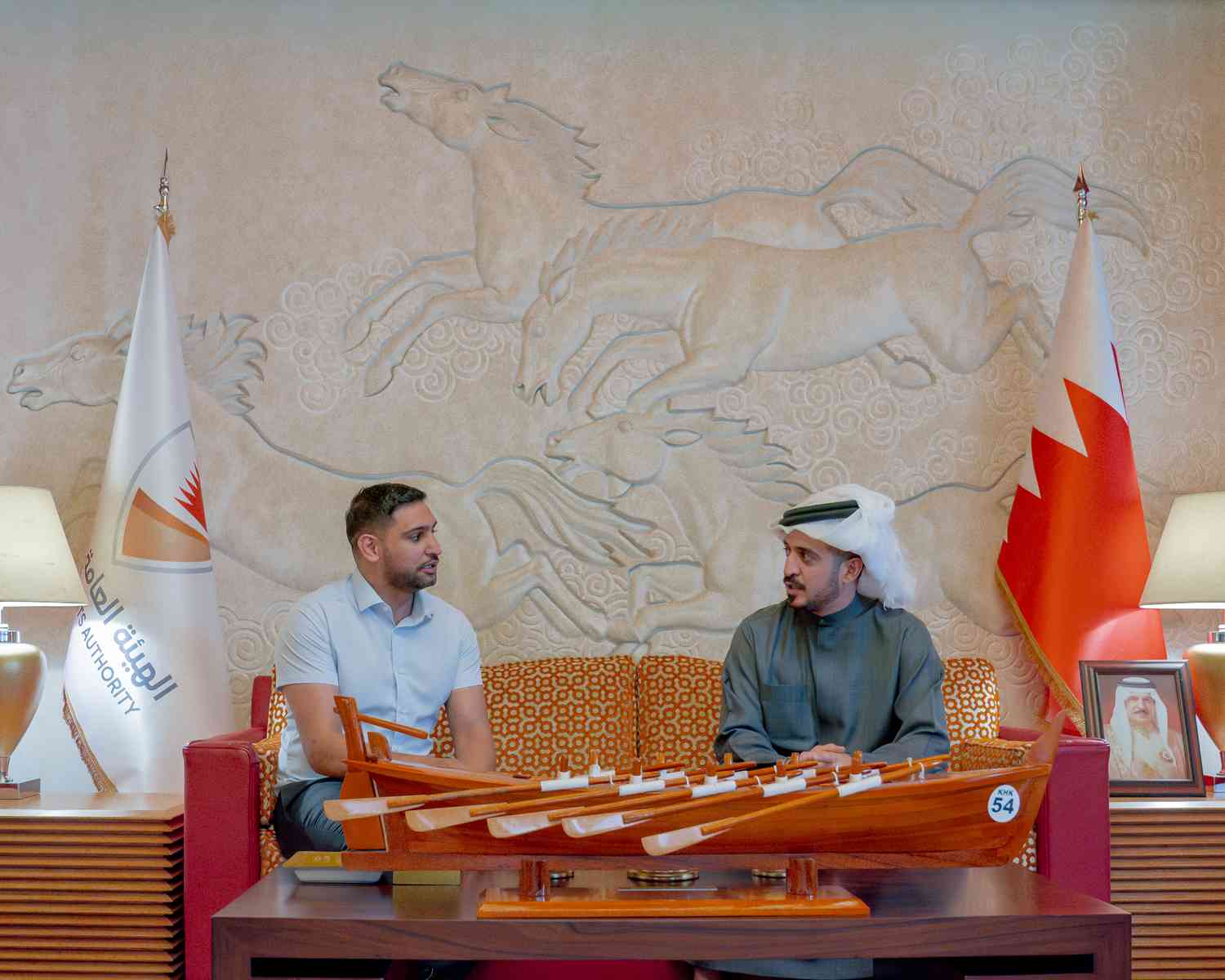 His Highness Shaikh Khalid bin Hamad Al Khalifa, First Deputy Chairman of the Supreme Council for Youth and Sports, Chairman of the General Sports Authority (GSA), and President of the Bahrain Olympic Committee, met with former British professional boxer Amir Khan.