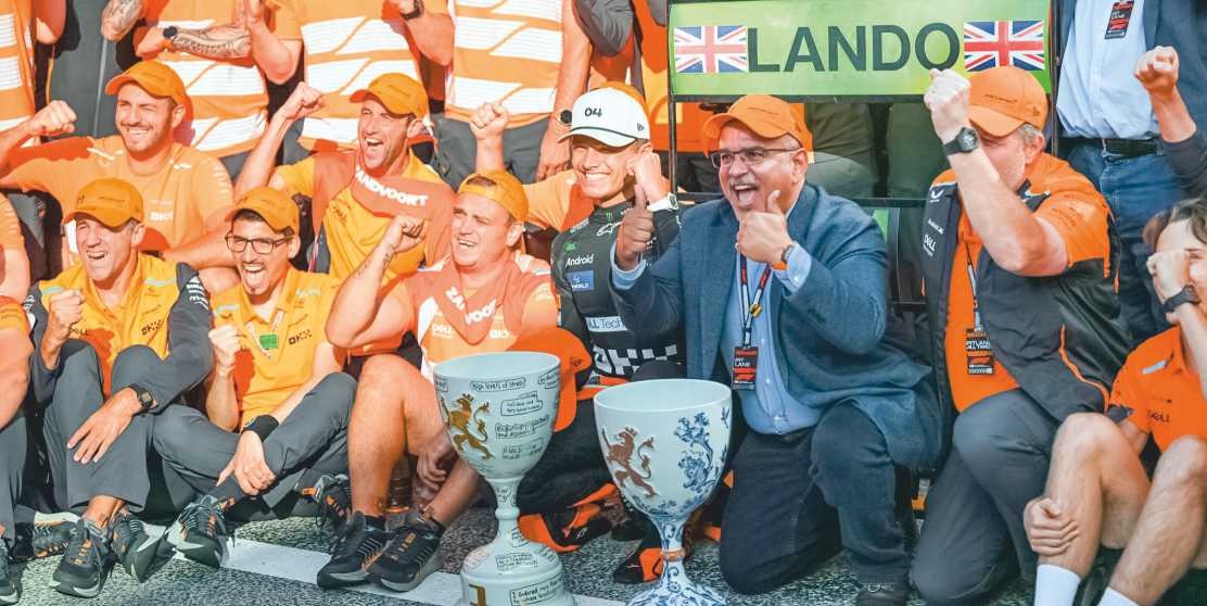 HRH the Crown Prince and Prime Minister commended the McLaren team for their outstanding performance and for being crowned the champions of the Dutch Grand Prix as he posed for photographs with the CEO Zak Brown and the team in the pit lane.