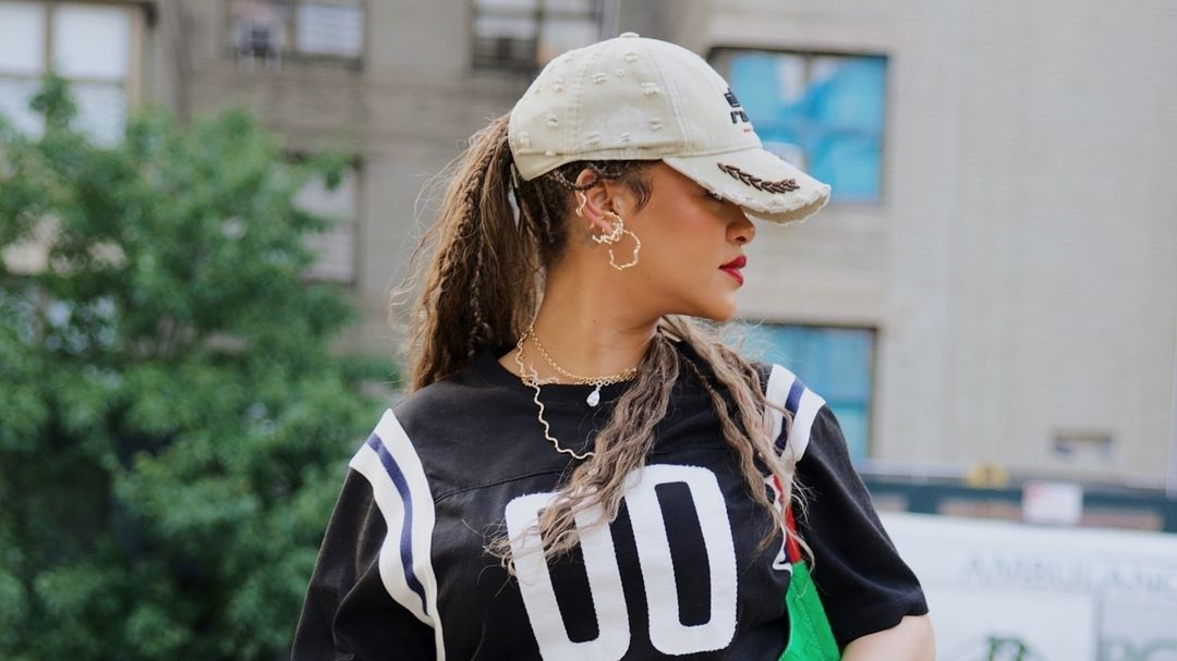 Rihanna once again proved her status as a style icon with a recent outing in New York City. The global superstar embraced the current Olympic spirit by donning a sporty yet chic ensemble. A black and white striped jersey paired with a checkered brown mini skirt over red Miu Miu shorts created a playful and unexpected look. A distressed beige baseball cap completed the sporty vibe, making her outfit a perfect reflection of the world’s current athletic focus.
