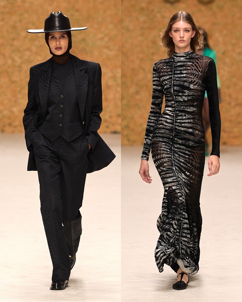 Puglisi’s collection dazzled with Cavalli’s signature animal prints—zebra stripes, leopard spots, and floral motifs—on trench coats, dresses, and silk shirts. Western influences, such as cowboy boots and hats, added a distinctive edge, while the Roar Bag, in new crocodile and lizard-effect variations, took center stage. Puglisi’s kaleidoscopic designs paid tribute to Cavalli’s vibrant heritage and modern sophistication.