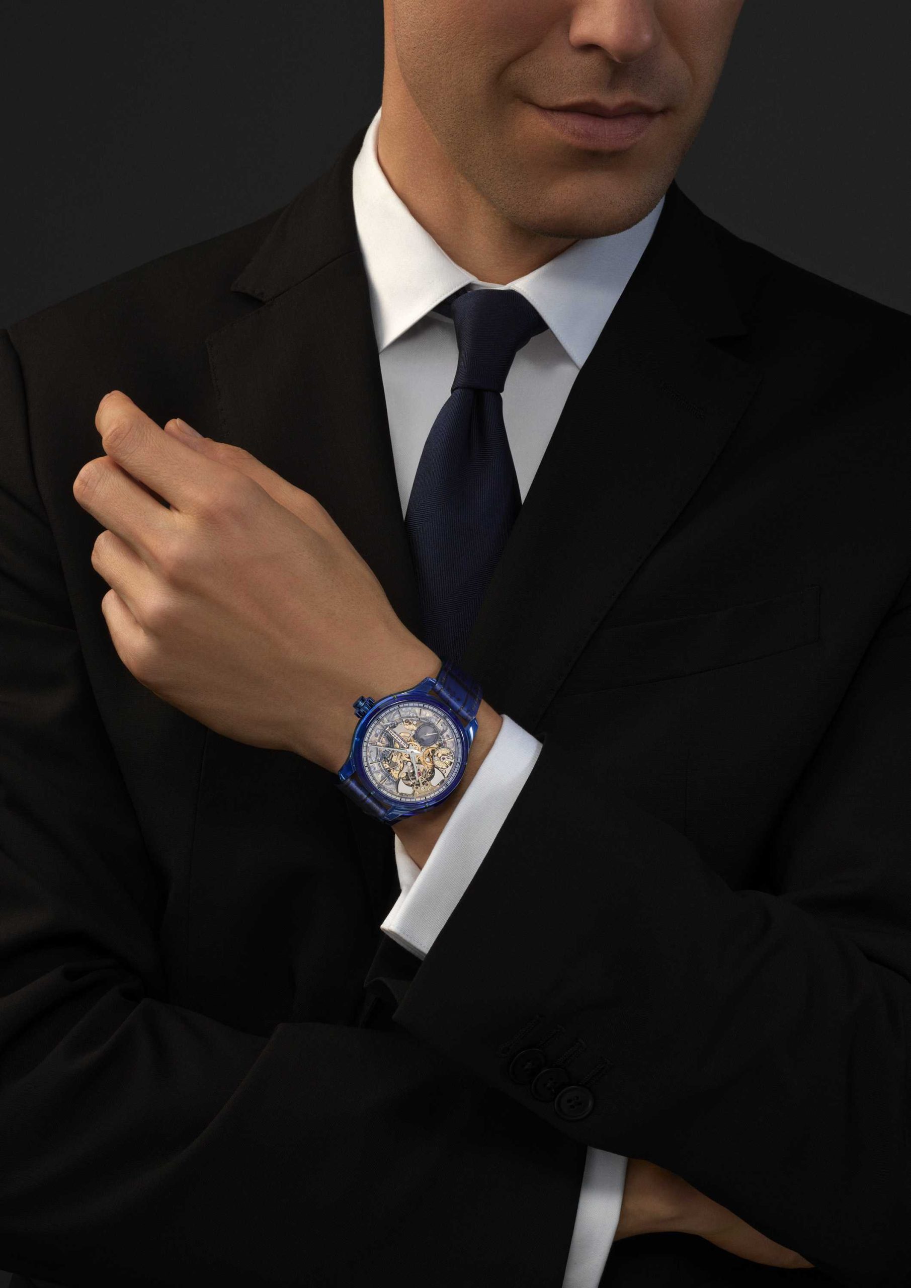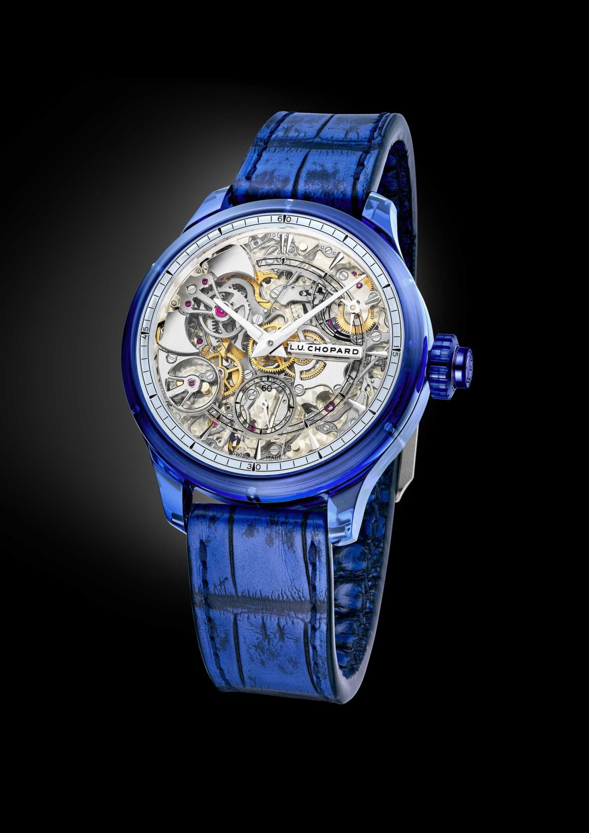 Featuring a complication that has become Chopard Manufacture’s field of horological excellence, the emblematic L.U.C Full Strike minute repeater is available in a new exclusive limited edition in blue sapphire limited to five pieces. In addition to the gongs of the L.U.C 08.01-L chronometer-certified calibre, the entire case, crown and dial of this new L.U.C Full Strike Sapphire model are cut from blocks of sapphire. Measuring 42.5 mm in diameter and featuring a totally transparent intense blue colour resulting from subtly dosed chromium and rare earth elements, it offers a 360-degree view of a movement with exceptional finishes. This entire horological prodigy bears the Poinçon de Genève quality hallmark. The acoustic richness of its chime achieves an exceptional level of quality, while perfect homogeneity makes it an unparalleled timepiece combining a stunning conceptual challenge with supremely accomplished execution.