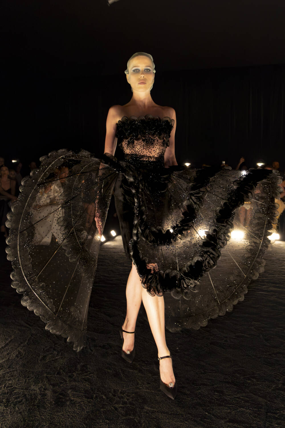 The collection opened with a breathtaking statement piece: a dramatic cape adorned with silver embroidery meticulously arranged to evoke the image of a gleaming phoenix taking flight. This theme of transformation continued with net circle skirts that flowed into provocative arabesques, revealing glimpses of shimmering gilded bugle bead embroidery beneath.